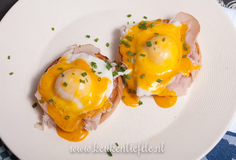 Beleg beide helften van de beschuitbol met een plak ham, gepocheerd ei en schenk de warme hollandaise-saus eroverheen. Serveer direct.
