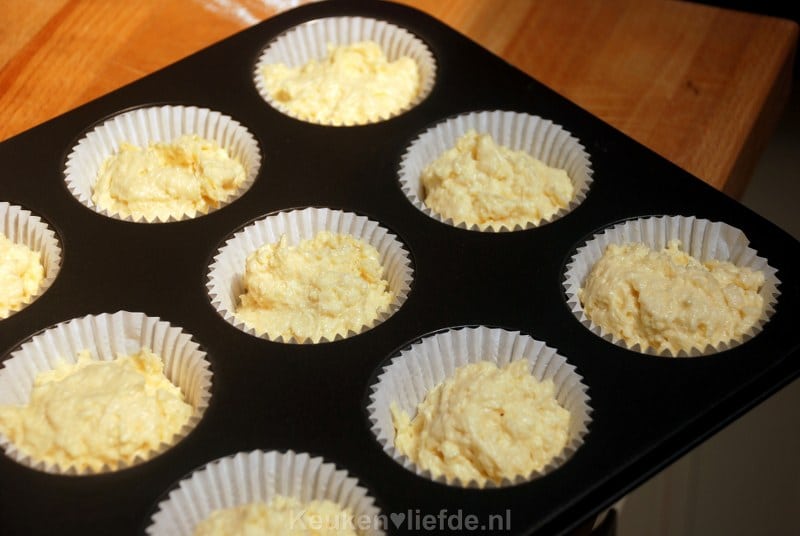 Schep in ieder vormpje ongeveer een ijsschep met cupcakebeslag (de vormpjes moeten niet helemaal met beslag gevuld zijn, maar wel voller dan in dit recept).