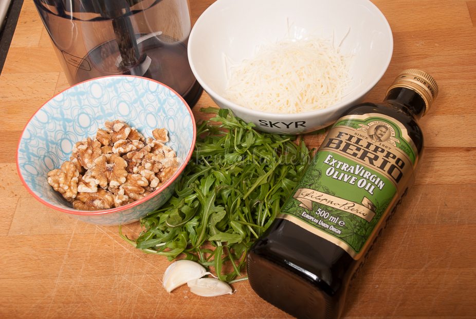 Doe alle ingrediënten in de keukenmachine samen met een flinke scheut olijfolie en mix tot een gladde pestosaus.