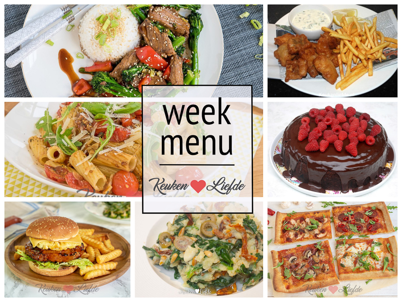 In dit weekmenu: pasta met cherrytomaat en knoflook, kipburger teriyaki, Italiaanse spinaziestamppot, roerbak biefstuk en zelfgemaakte kibbeling. In het weekend geniet je van een heerlijke plaatpizza en chocoladetaart! Ik wens je alvast een smakelijke week toe!