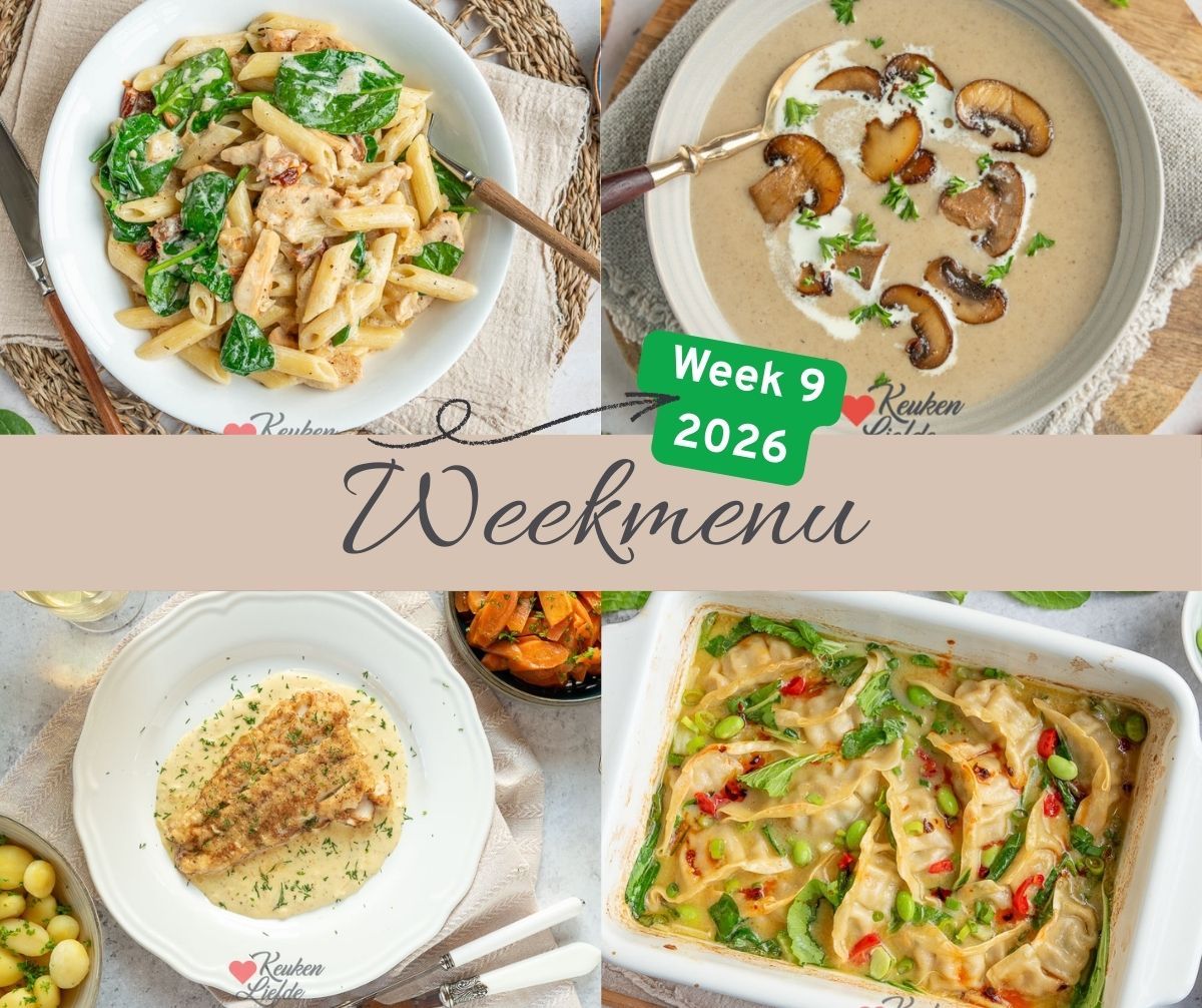 Weekmenu week 9 (2026) – Wat eten we vandaag? Die vraag duikt hier ook standaard op zodra het richting etenstijd gaat. Daarom zet ik een nieuw weekmenu voor je klaar: zes makkelijke maaltijden voor doordeweeks, op zaterdag een lekker soepje en op zondag sluiten we af met iets zoets.