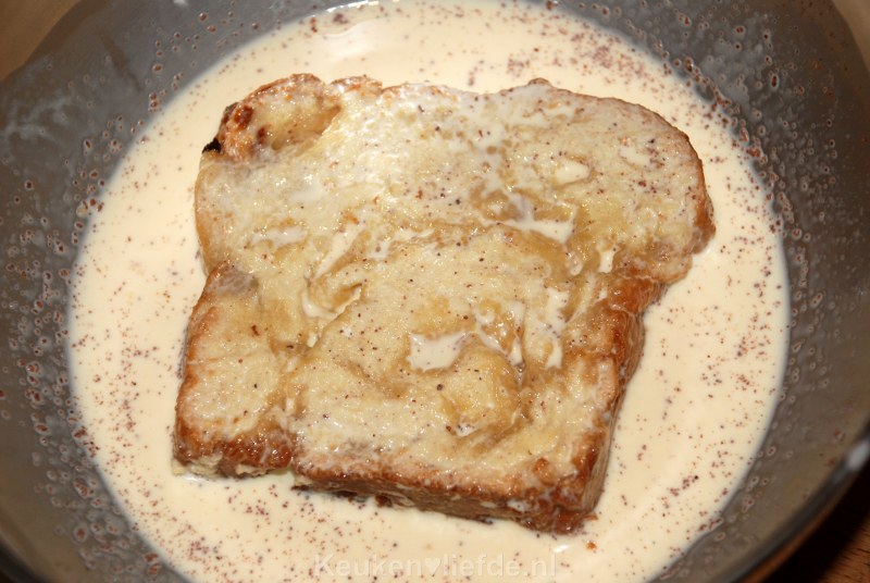 Klop het ei los met de room en roer er wat kaneelpoeder doorheen. Dompel het brood aan beide kanten goed door het eimengsel.