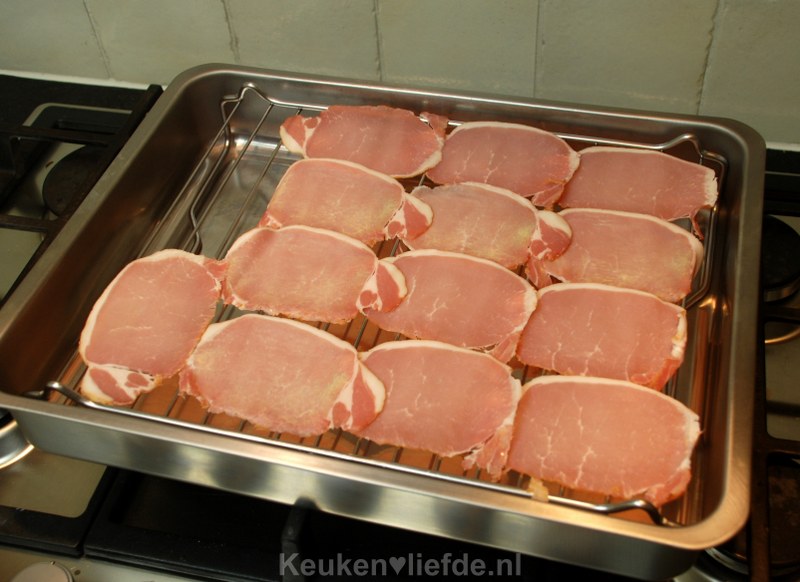 Als de bacon te snel bruin wordt, zet je de oventemperatuur wat lager. De bacon is goed als hij goudbruin en krokant is.