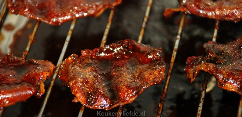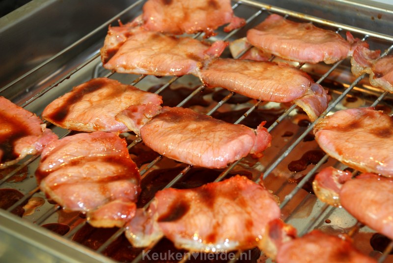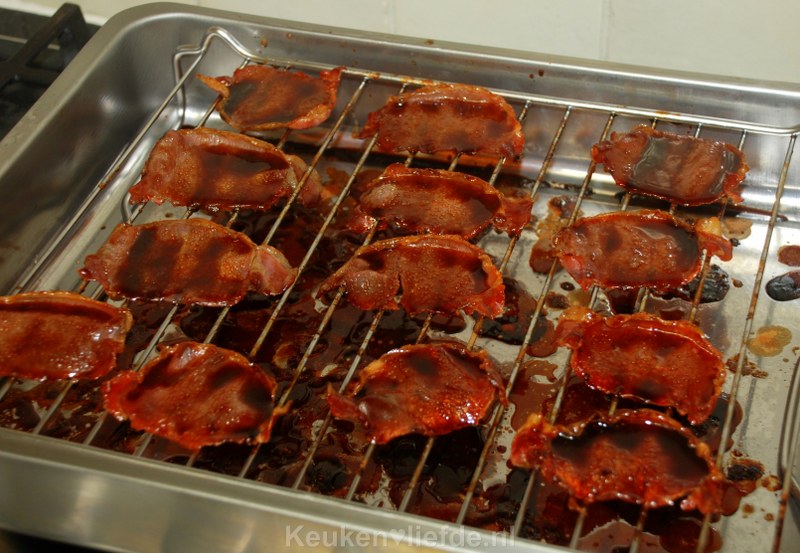 Haal na 10 minuten uit de oven en bestrijk opnieuw met de marinade. Draai de bacon om en bestrijk ook de andere kant met de marinade. Schuif weer in de oven en herhaal dit nog twee keer.