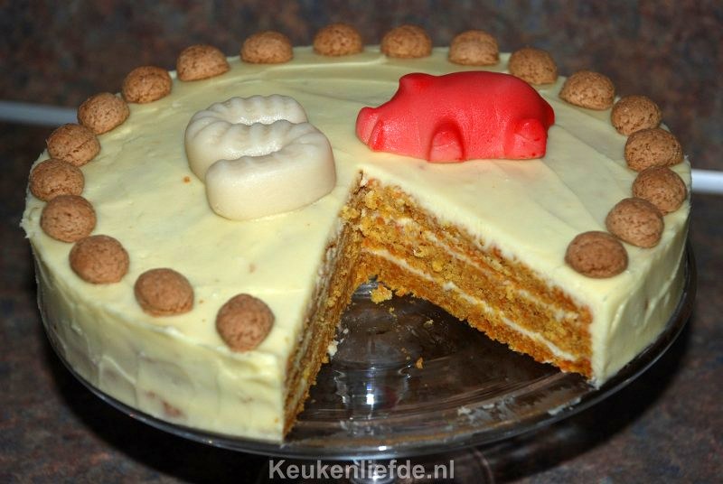 Deze worteltaart met kruidnoten en botercréme is de perfecte taart om te serveren op pakjesavond! Deze taart heeft drie lagen wortelcake met ertussen smeuïge botercrème met roomkaas. De taart wordt rondom afgesmeerd met botercréme en feestelijk gegarneerd met kruidnoten.