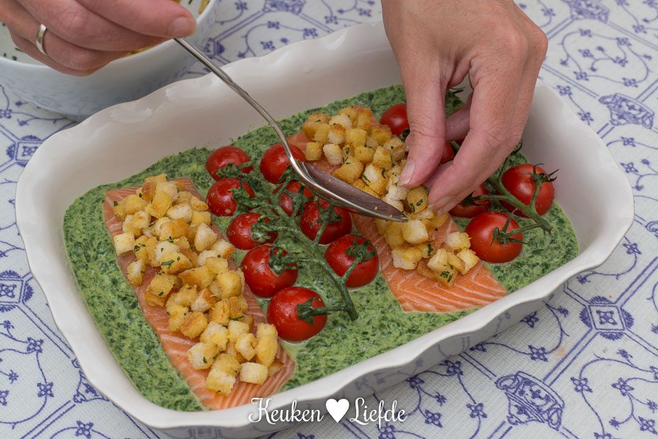 Verdeel de spinazie over de ovenschaal en leg de zalm en trostomaten erbovenop. Dek de zalm royaal af met het croutonmengsel en druk voorzichtig aan.