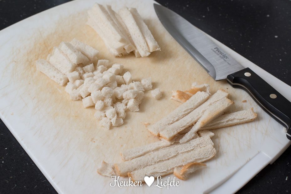 - 2 sneetjes wit casinobrood, korsten eraf en in kleine blokjes gesneden