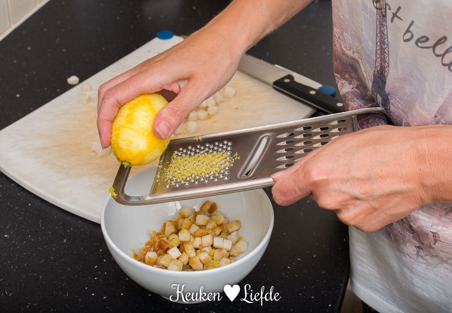 Bak de broodblokjes in een koekenpan met wat olie of boter, totdat ze licht goudbruin zijn. Rasp de helft van de citroen — niet het witte gedeelte, dat smaakt bitter. Hak een aantal blaadjes basilicum fijn, houd een paar blaadjes achter voor garnering. Meng de broodcroutons met de helft van het ei, citroenrasp, fijngehakte basilicum en breng op smaak met zout en peper.