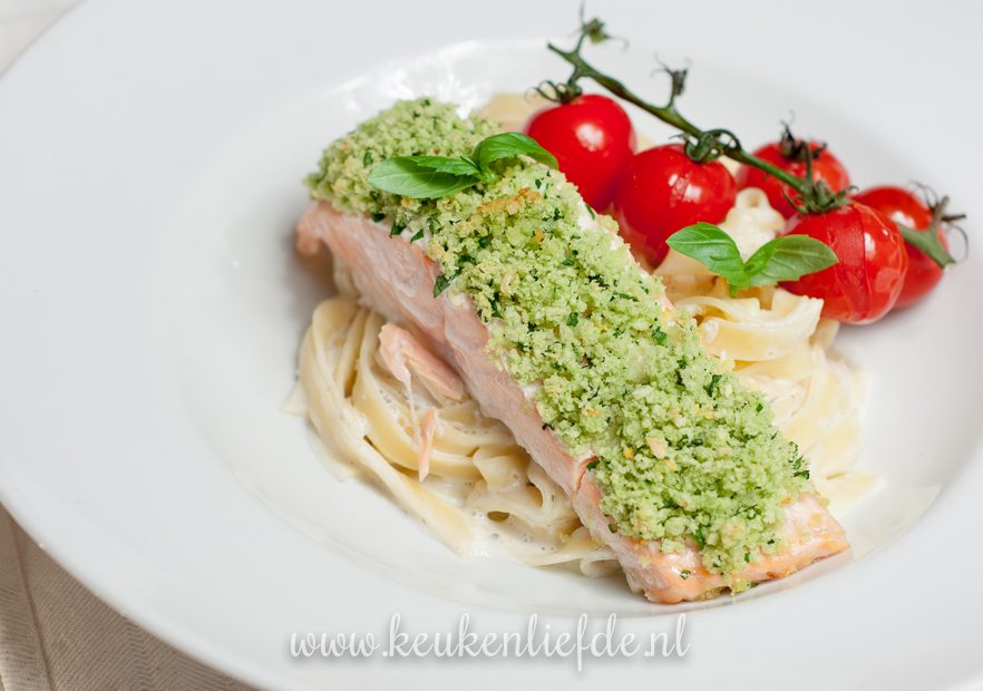 Hier zat je op te wachten hè? Een makkelijk hoofdgerecht voor kerst! Omdat je met kerst vaak meerdere gangen serveert is het fijn om de gerechten simpel te houden. Deze zalm uit de oven met groene kruidenkorst staat vliegensvlug op tafel. De groene kruidenkorst kun je van tevoren al klaarmaken en in een luchtdichte zak bewaren. Vlak voor serveren verdeel je het kruidenmengsel over de zalm die je daarna samen met wat trostomaatjes de oven inschuift. Terwijl je ontspannen nipt van je drankje kook je de tagliatelle gaar.