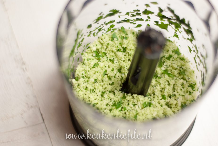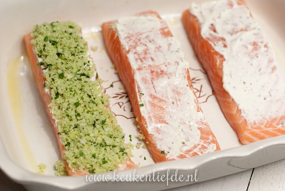 zeer lekkere kruidenkorst, ik voegde wel olijfolie toe in de blender om het wat makkelijker te kunnen ‘smeren’ op de zalm