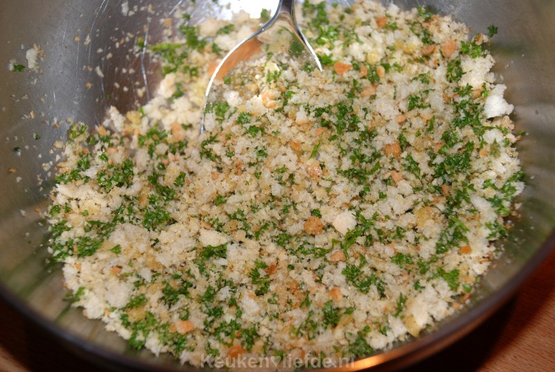 Verwarm de oven op 200 graden. Maal het broodje, de knoflookteen en peterselie fijn in de keukenmachine. Doe in een kom en meng met 1 à 2 eetlepels olijfolie, zodat er een smeuïg mengsel ontstaat.