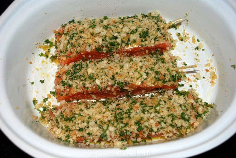 Vet lichtjes een ovenschaal in en leg de zalm erin. Verdeel het peterseliekruim erover en druk lichtjes aan.