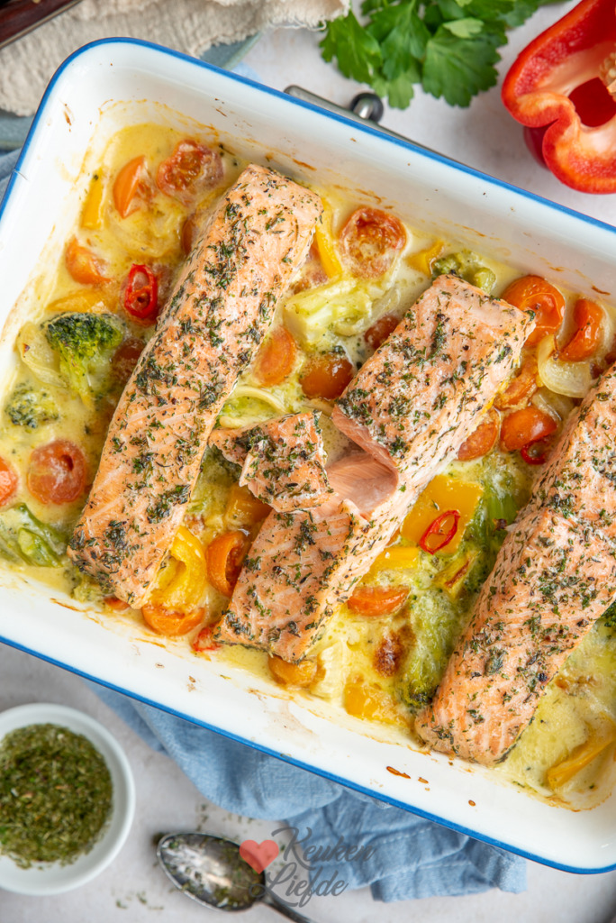 Veel makkelijker dan dit recept wordt koken niet. Je hoeft alleen wat snijwerk te verrichten, daarna doet de oven de rest van het werk. Voor de groenten heb ik gekozen voor cherrytomaatjes, broccoli en paprika. Ze hoeft ze niet eerst voor te garen, ze garen in de roomsaus in de oven. Na 15 minuten leg je de zalm bovenop de groenten en roomsaus en gaat de schotel opnieuw de oven in tot alles gaar is.