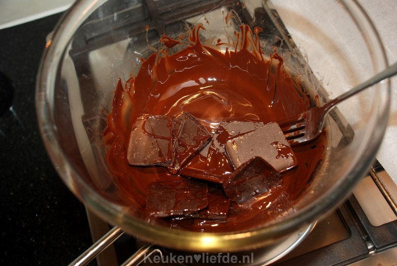 Smelt de chocolade au bain-marie en giet de gesmolten chocolade in een klein kommetje.