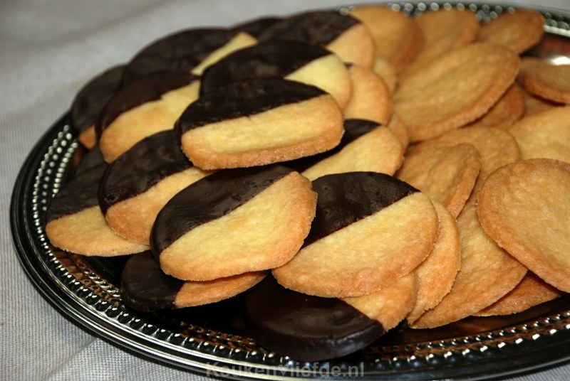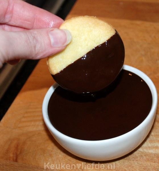 Dit is een heerlijk en makkelijk te maken recept voor zelfgemaakte zandkoekjes. Door de koekjes na het bakken voor de helft in gesmolten, pure chocolade te dippen krijgen ze een luxe uiterlijk. Daarnaast smaken de koekjes op deze manier natuurlijk ook heerlijk!