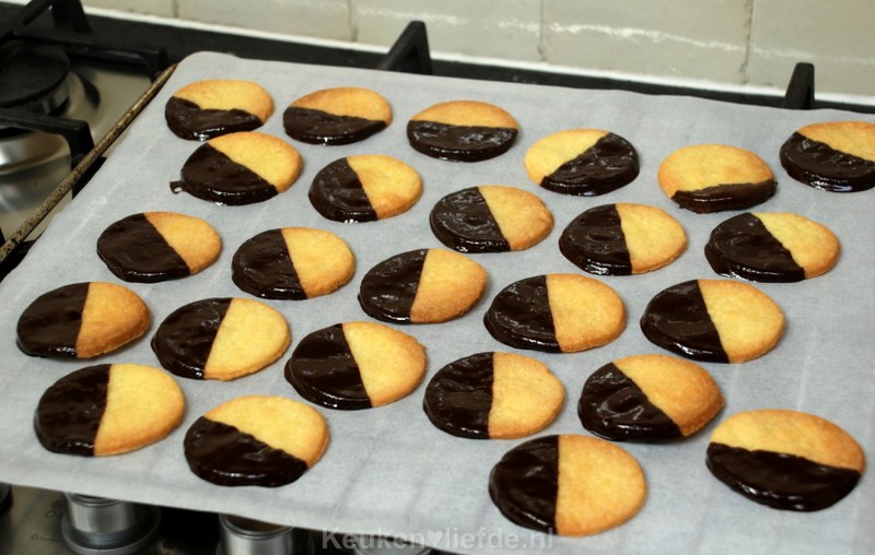 Dip de koekjes voor de helft in de chocolade en leg ze op een vel bakpapier.