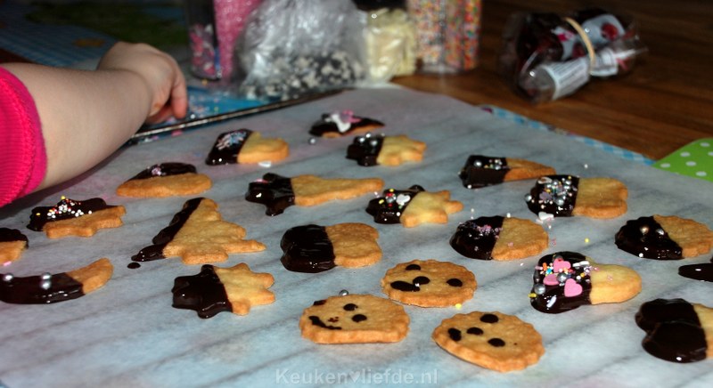 Laat de chocolade op een koele plek weer hard worden, of versier de koekjes verder door eetbare decoratie over de chocolade te strooien.