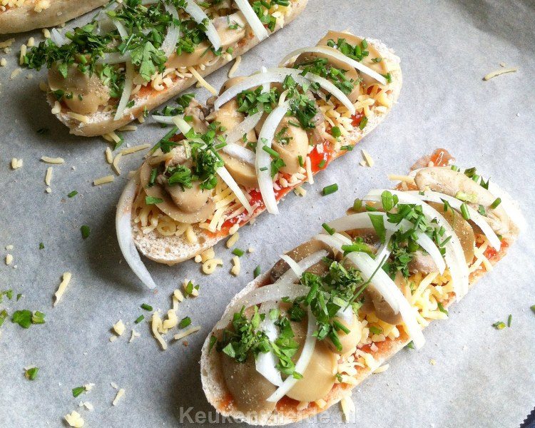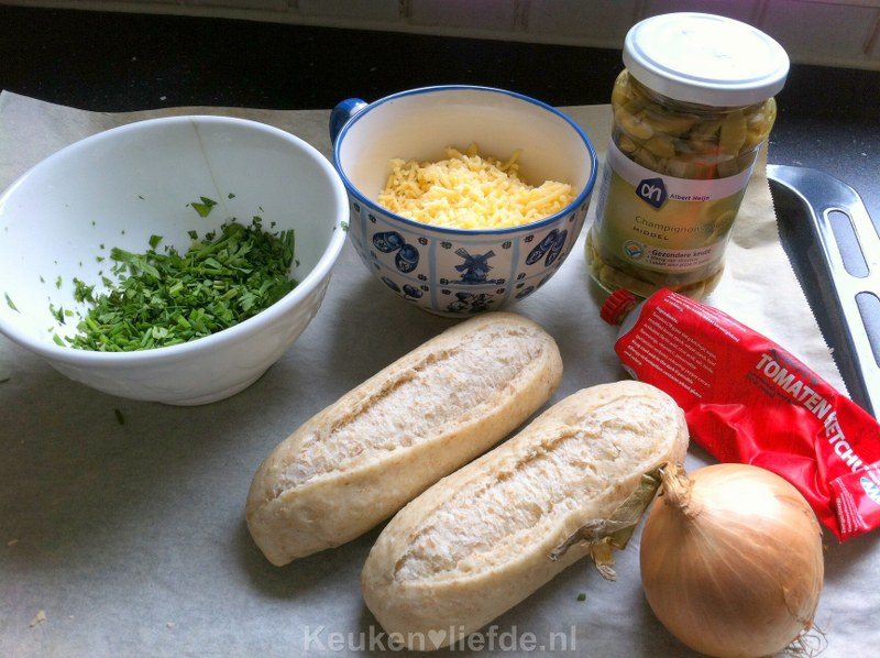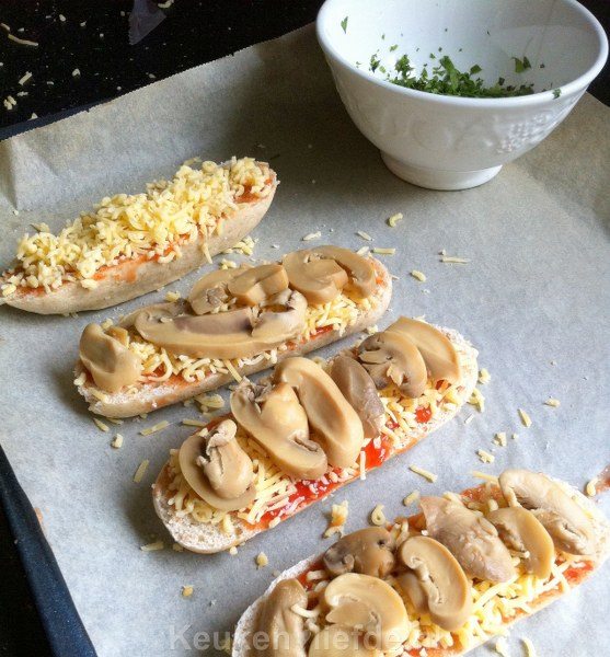 Je kunt de champignons en uien ook eerst in een koekenpan goudbruin te bakken, alvorens ze op het broodje te leggen.