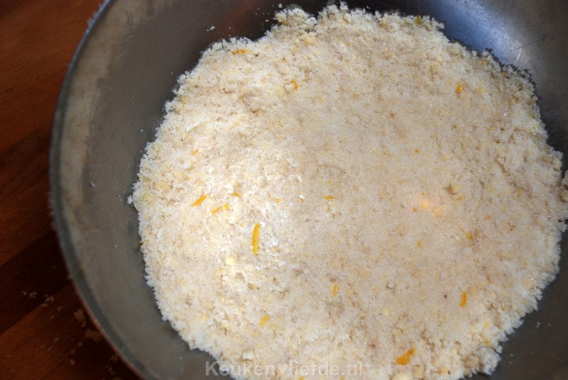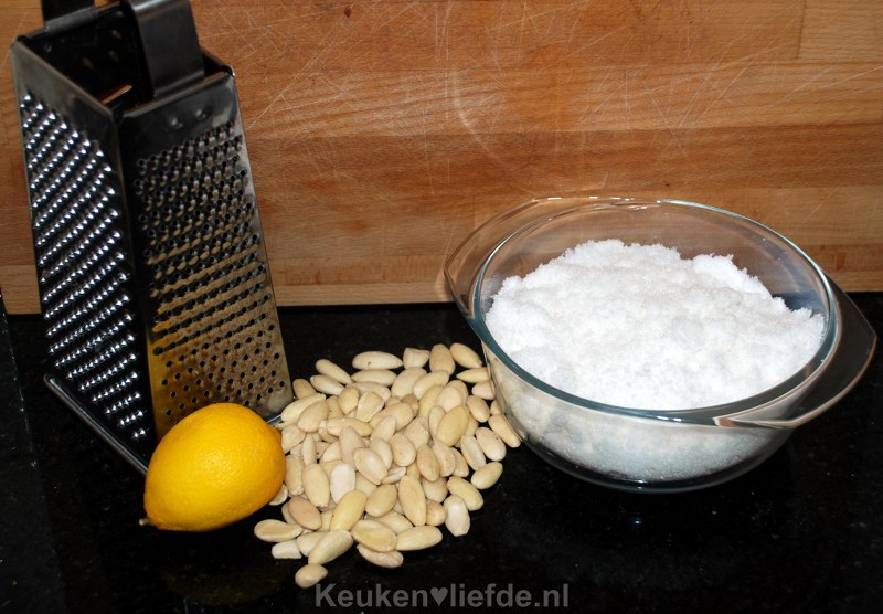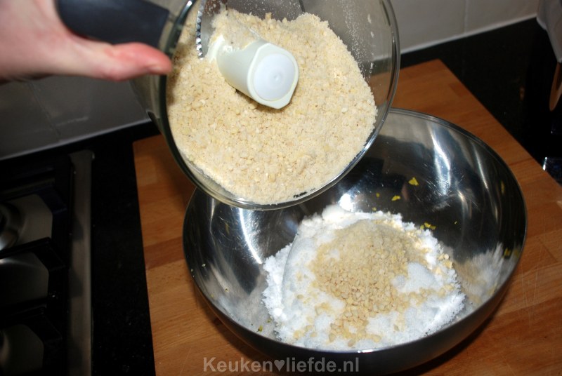 Meng in een grote kom het amandelmeel met de suiker en de citroenrasp.