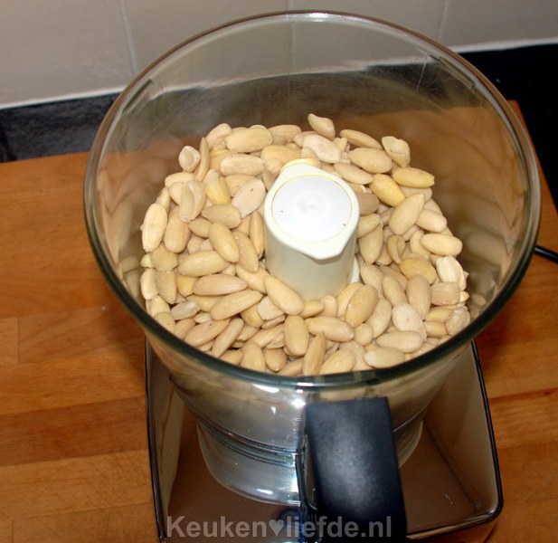 Maal de amandelen fijn in de keukenmachine met de pulse-knop of in een speciale amandelmolen (verkrijgbaar in een speciaalzaak).