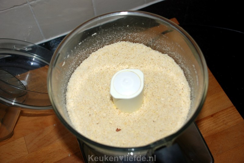 Stop direct met malen wanneer je ziet dat het amandelmeel blijft plakken aan de kom. Dit is namelijk een teken dat er olie vrijkomt uit de noten, en het mengsel moet droog blijven. Het is niet erg als er nog iets wat grotere stukjes in het meel zitten.