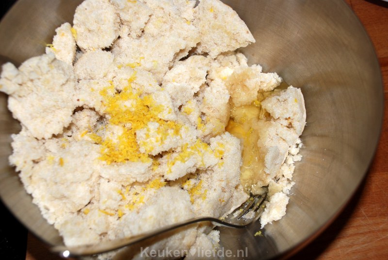 Maak het amandelspijs los met een vork en meng het ei en de citroenrasp erdoor.
