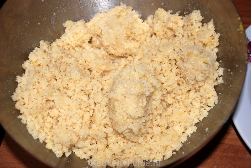 Kneed met je handen en voeg eventueel een paar druppels water toe, totdat het spijs aan elkaar blijft plakken. Het mengsel zal echter vrij bros blijven, dit hoort zo. In een later stadium, vlak voordat je het amandelspijs gaat verwerken, wordt er ei toegevoegd om het smeuïg te maken.