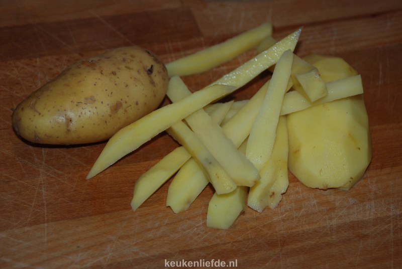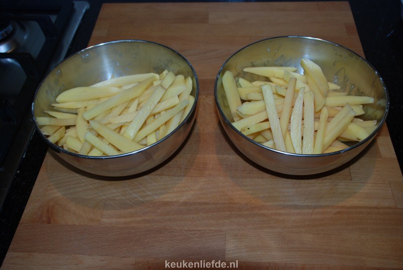 De frietjes worden eerst voorgebakken in ossewit en later afgebakken in de arachideolie. Het bakken in ossewit geeft de heerlijke smaak aan je friet en afbakken in arachideolie (die beter bestand is tegen hoge temperaturen) zorgt ervoor dat je frietjes knapperig worden. Je hebt voor dit recept dus 2 frituurpannen nodig. Natuurlijk kun je de friet ook voorbakken in dezelfde olie als waar je later ook de friet in afbakt maar het voorbakken in ossewit geeft zoveel smaak aan je friet dat de aanschaf van een extra frituurpan meer dan de moeite waard is.