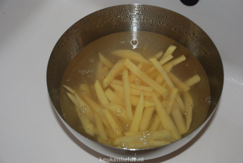 Een tip voor knapperigere friet is om ze voor het bakken minimaal een half uur in zout water te laten staan waardoor het vocht ontrokken wordt uit de friet.