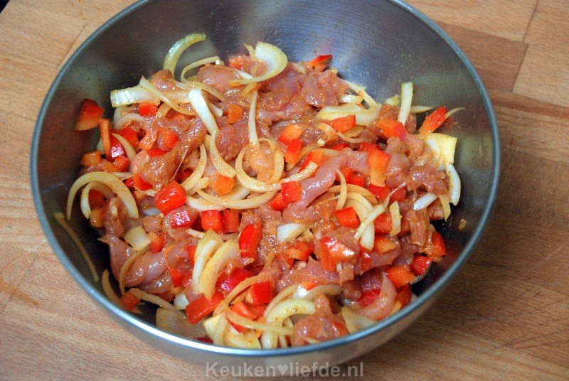 Roer het geheel door elkaar en kruid de shoarma er mee, laat het 1 uur intrekken en dan pas bakken.