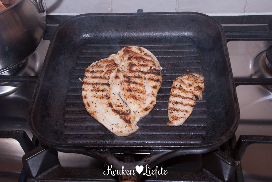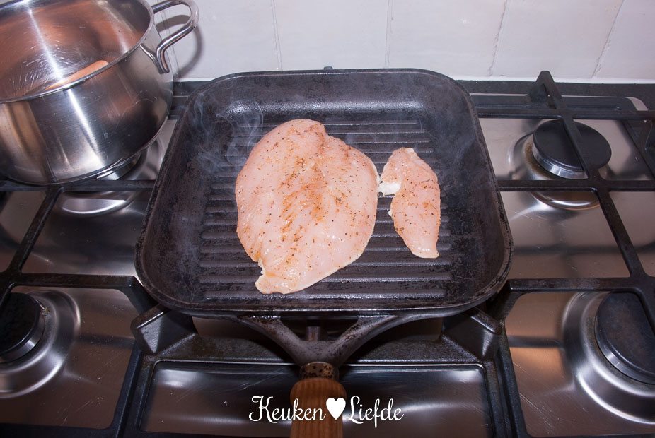 Snijd de kip over de lengte doormidden (niet helemaal doorsnijden) en bestrooi met cajunkruiden en wat olie. Wrijf de kruiden aan beide kanten goed in de kip. Grill de kip in de hete grillpan, aan beide kanten, totdat hij gaar is.