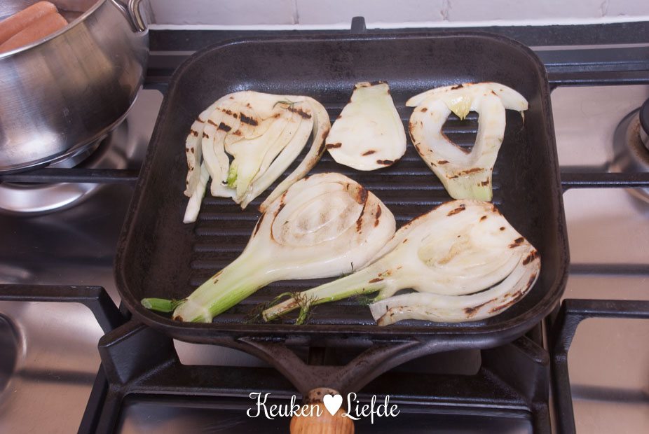 Verhit ondertussen de grillpan en laat heet worden. Snijd de venkel in smalle plakken (houd wat groene sprietjes achter voor de garnering) en hussel ze in een kom om met wat olie. Grill de venkel in de grillpan, totdat beide kanten mooie grillstrepen hebben en de venkel wat zachter is. Doe de venkel in een grote kom.