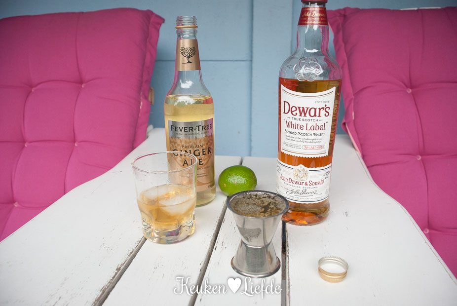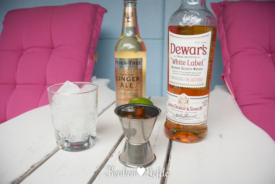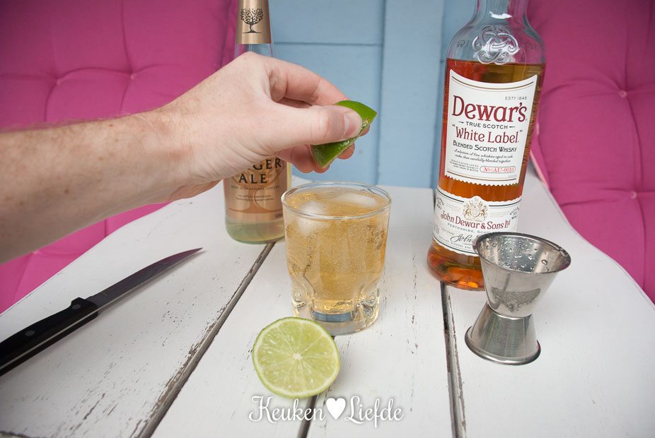 Vul een tumblerglas met ijsblokjes, giet daarover Dewar’s en de premium ginger ale. Knijp wat sap uit de limoenschijfjes over de mix en drop de schijfjes in het glas. Eventueel voorzichtig omroeren.